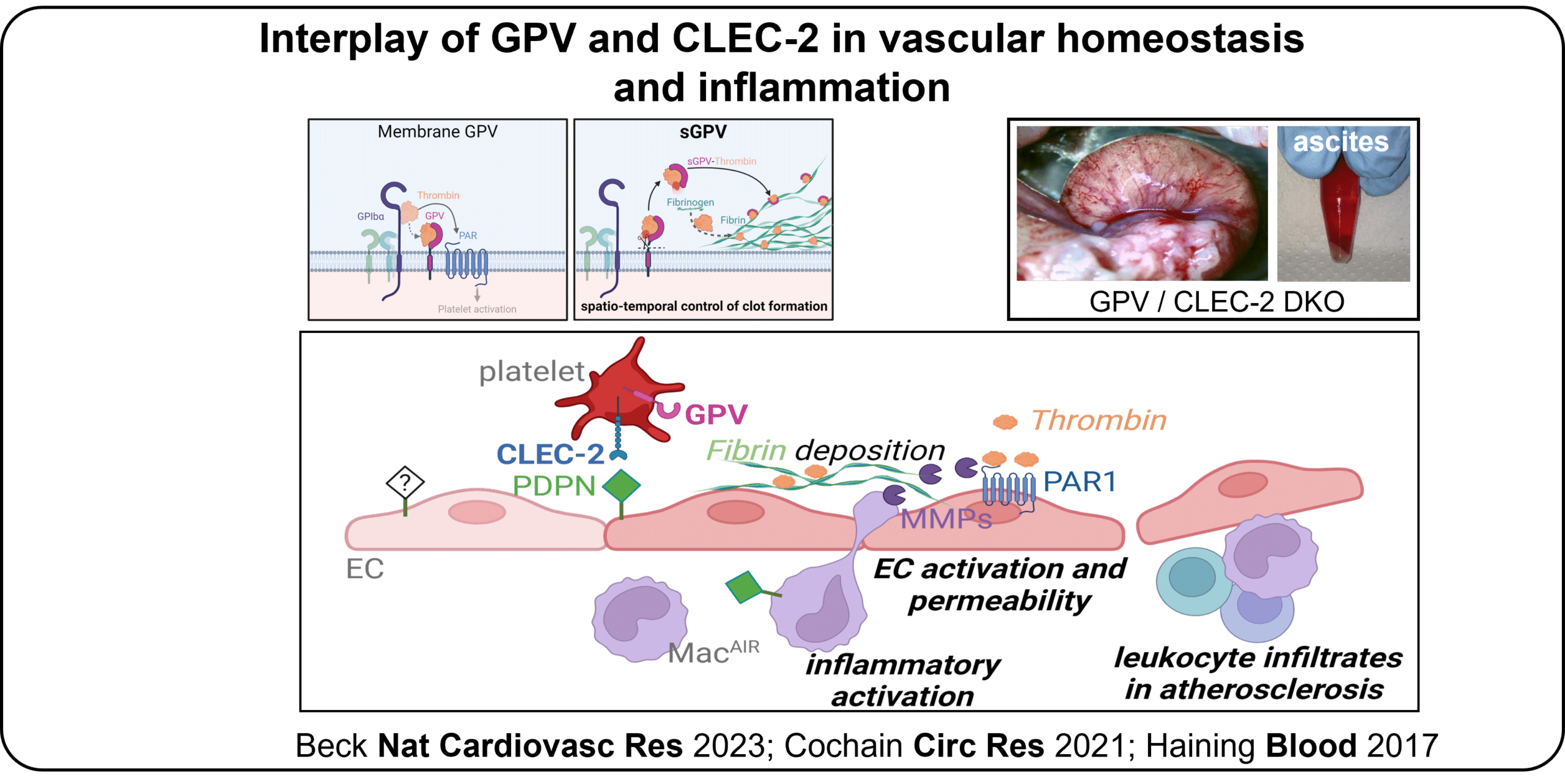 Platelets, via their adhesive receptors (GPIb, GPVI, CLEC-2), monitor vascular integrity and control the trafficking and function of immune cells. GPV, part of the GPIb-V-IX complex, is proteolytically cleaved by thrombin and thereby spatio-temporally controls thrombin activity and fibrin generation, while CLEC-2 is critical for blood-lymphatic separation, vascular homeostasis, and limits macrophage inflammatory activation. Mice deficient for both, GPV and CLEC-2, display altered vascularisation pointing to a loss of vascular barrier function. We hypothesize that the interplay of platelet receptors GPV and CLEC-2 is required to maintain vascular integrity in homeostasis and thrombo-inflammatory processes. P02 aims to understand how GPV and CLEC-2 synergistically act together and protect from vascular inflammation, and how platelets through these receptors interact with endothelial cells and immune cells to ensure vascular integrity and homeostasis in health and disease, e.g. during atherosclerosis. To address these questions, we will generate and apply antibodies against GPV, GPIb and CLEC-2 and employ genetic/humanized mouse models and recombinant proteins to study the interplay of GPV and CLEC-2 in vivo and in vitro. We will use confocal (intravital) microscopy of multiple tissues (e.g. mesenteries, retina) to examine vascularization, vascular integrity and platelet-EC interactions, study platelet-immune cell interactions under static and flow conditions (microfluidics), and use scRNA sequencing.
